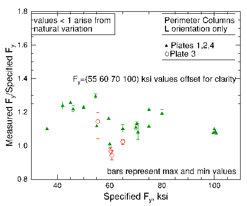 Tensile tests of the dozens of steel types and grades recovered showed that their yield and tensile strengths are consistent with the expected values. In a few cases, the strengths of the NIST-tested specimens were slightly less than called for, but the number of under-strength samples is consistent with the natural variability in steel strength and the damaged state of the recovered steel. Figure 2 shows the ratio of measured to specified yield strength for recovered perimeter column steels.